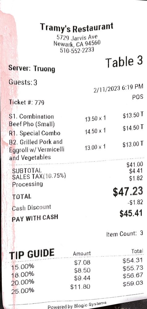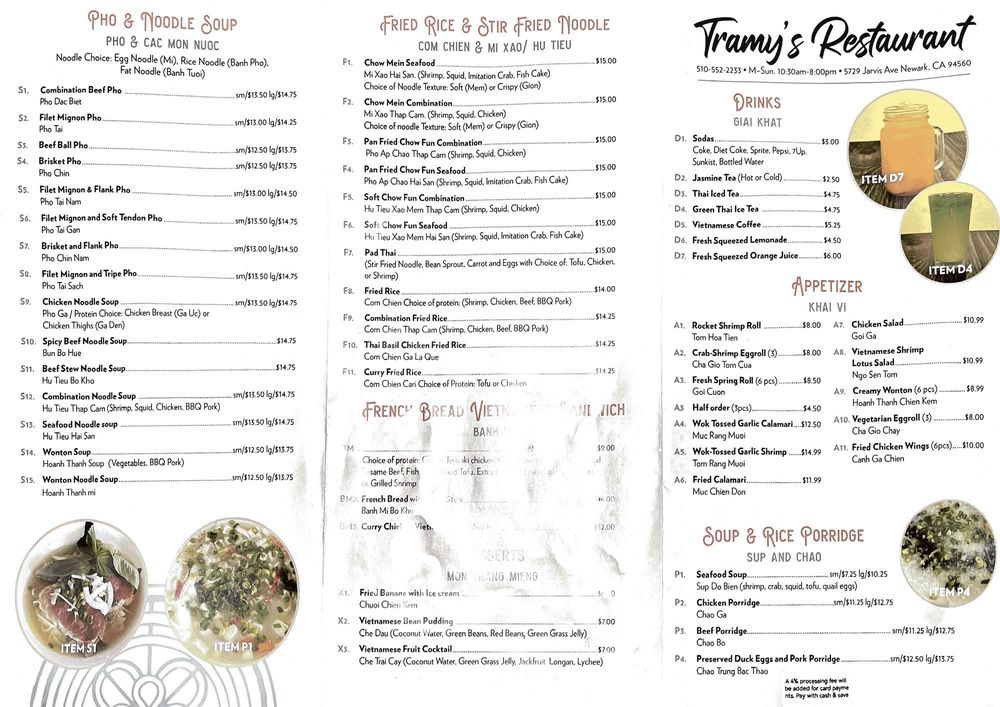 Tramy's Restaurant, located in Newark, CA, offers a delectable menu of traditional Vietnamese dishes. From tasty appetizers like Rocket Shrimp Rolls and Chicken Salad to hearty Pho noodle soups with a variety of protein options, there is something for everyone to enjoy. The restaurant prides itself on its beautifully presented dishes, excellent service, and clean, inviting atmosphere. Customers rave about the Banh Beo appetizer and Lemongrass Pork Combination Plate. Tramy's is a hidden gem in a strip mall, providing affordable prices, generous portions, and authentic flavors. Whether you're craving a comforting bowl of soup or a flavorful rice dish, Tramy's Restaurant is a must-visit spot for Vietnamese cuisine enthusiasts.